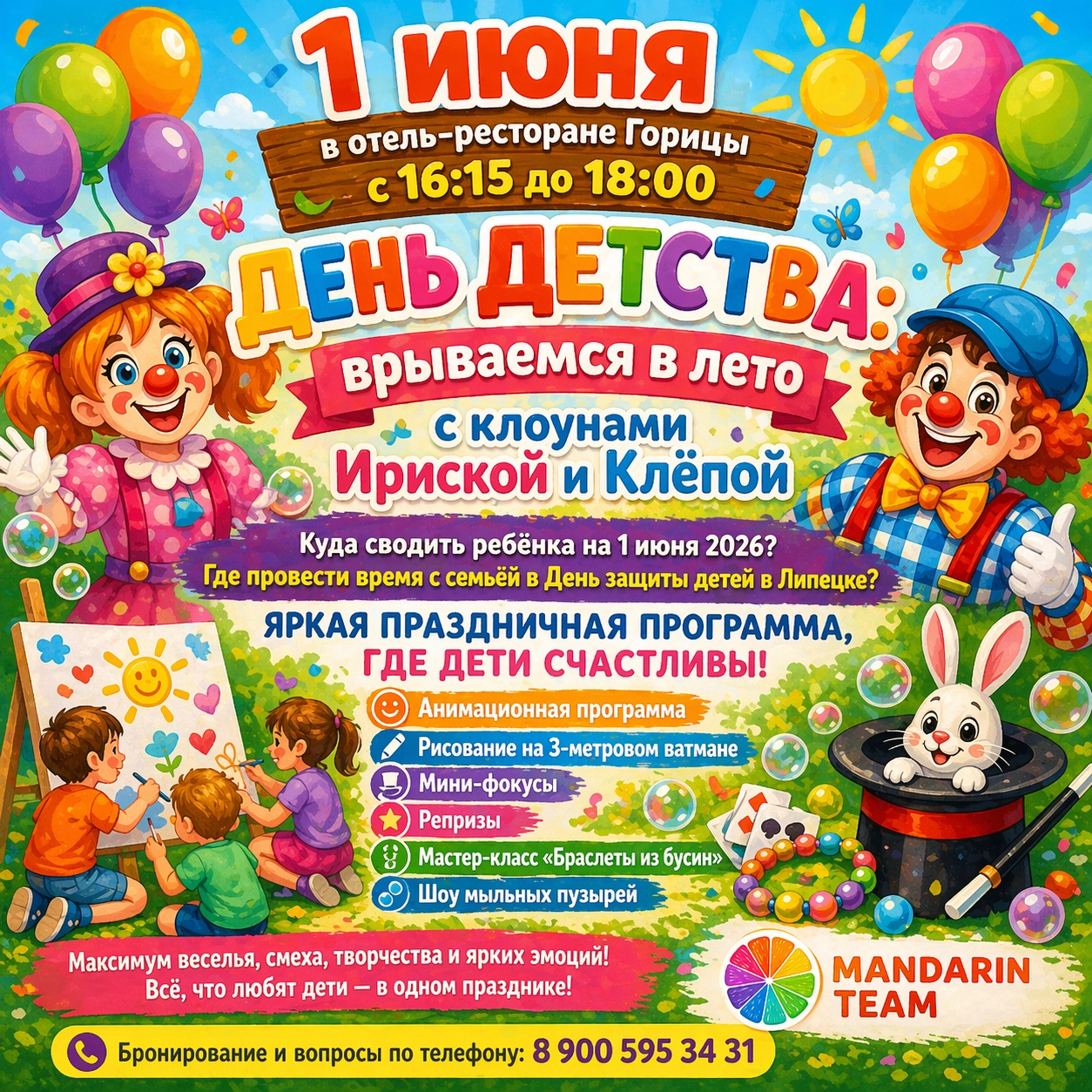 Здесь будет всё: смех, клоунада, фокусы, творчество и вовлечение каждого ребёнка. Дети не просто смотрят — они участвуют, играют, создают и получают удовольствие от каждой минуты.
