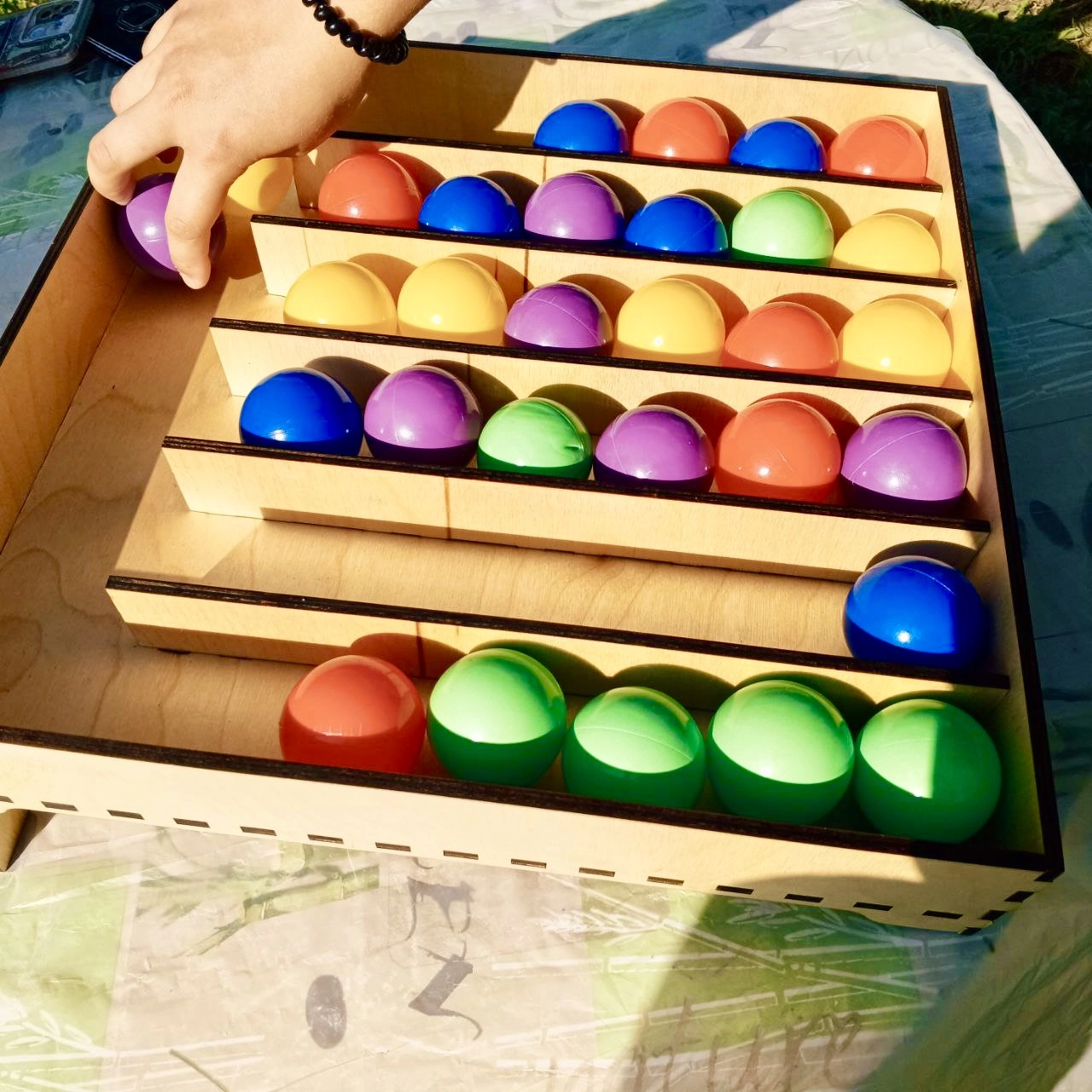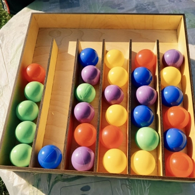 2. По одному перекладывайте шарики в ячейки — все одного цвета в одну секцию.