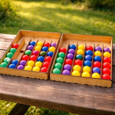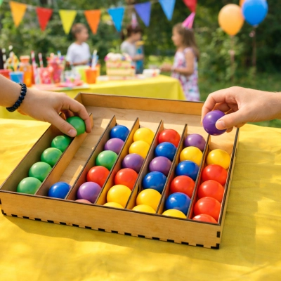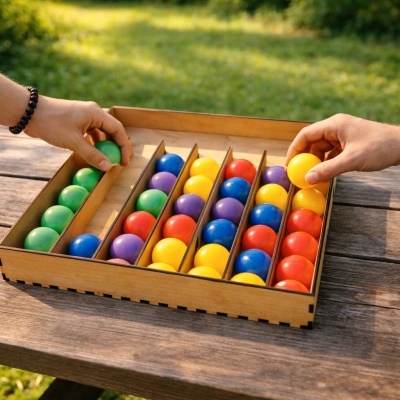 «Сортер шарики» — где каждый цвет на своем месте… или все пойдет не так! Размести шарики по цветам — и стань мастером порядка! Просто? Попробуйте — и вы поймёте, почему это так увлекательно. Это не просто деревянная коробка с ячейками — это цветовая логическая головоломка, где каждый шарик — это вызов вашему вниманию, терпению и чувству гармонии.Яркие пластиковые шарики разных цветов (красный, синий, зелёный, жёлтый, фиолетовый) нужно аккуратно разложить по отсекам — все шарики одного цвета в одну ячейку. Звучит просто? Подождите, пока не начнёте перекладывать — и поймёте, что даже самый маленький шарик может стать причиной хаоса.